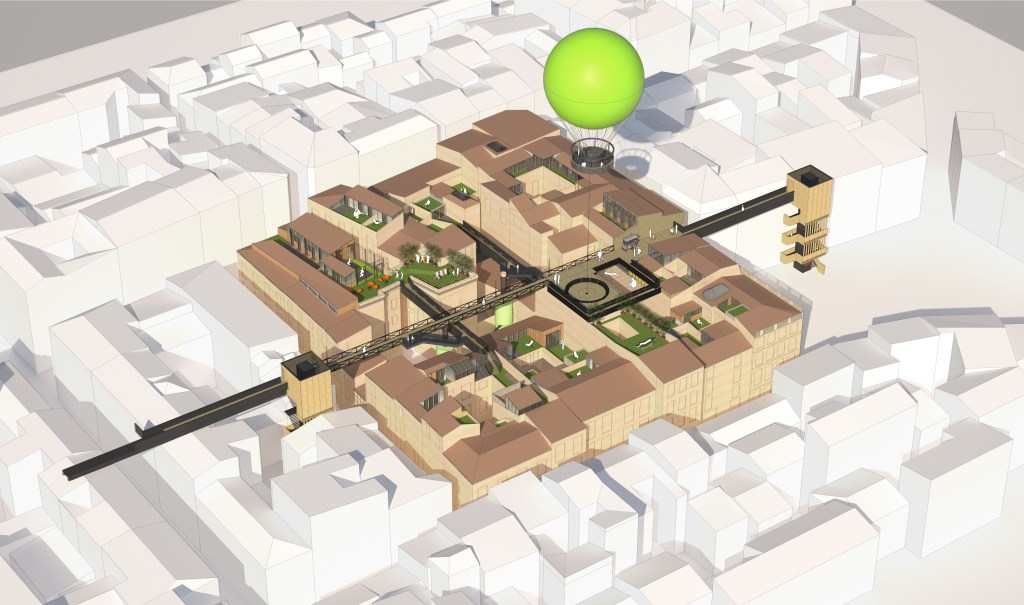 Ces deux typologies bien distinctes s’articulent autour d’un espace public suspendu, et permettent de créer une « vie de quartier » au niveau des toits.