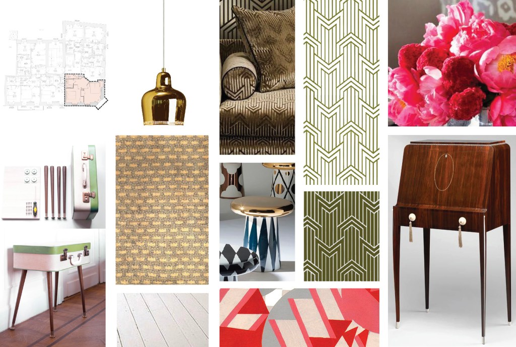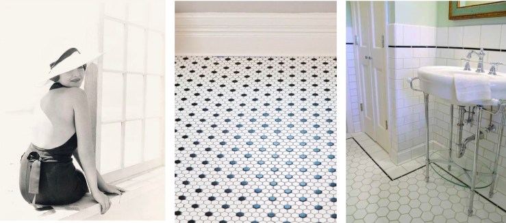 Sols en marbre ou Granito-Terrazzo bichromes blanc à tapis noirs, boiseries de placage d’Acajou verni, laiton poli en joints creux ou en feuille de protection.