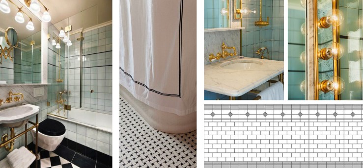 Nous croyons à la simplicité de cette combinaison, le blanc pur et aérien souligné d’un filet noir, une combinaison qui évoque la modernité de ces années 20, graphiques et inspirantes. Ce choix décoratif fort est adouci par l’utilisation de touches polies et dorées. Le principe graphique, simple mais élégant permet une économie de mise en œuvre et donc l’utilisation de matériaux de qualité dans les salles de bains.
